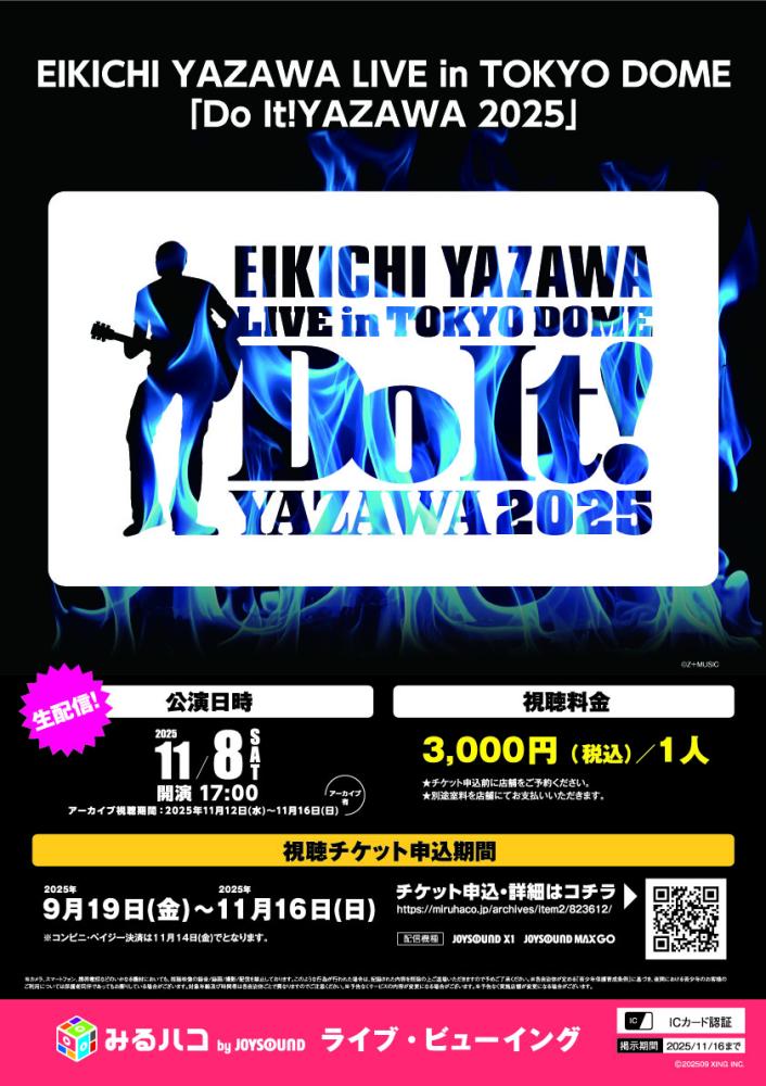 2025年10月17日 みるハコ【Do It!YAZAWA 2025】 ソロデビュー50周年を記念した東京ドーム公演のみるハコ配信が決定! 今年でソロデビュー50周年を迎える矢沢永吉。今年は、6月に横浜、9月に大阪でエキシビション「俺たちの矢沢永吉」展を開催。そして、アニバーサリー・イヤーを記念して東京ドームで2日間コンサートを行う。東京ドームは2018年9月 以来、7年ぶりとなる。また、この公演をもって東京ドーム単独公演・最年長記録がポール・マッカートニーと並び日本人アーティストに限れば76歳になる矢沢永吉が最年長となる。 ご視聴希望の方は事前「みるハコ」ご予約をお願い致します。
