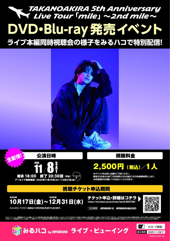 2025年10月17日 みるハコ【TAKANOAKIRA 5th Anniversary Live Tour mile ?2nd mile?】 5周年を記念したライブ本編同時視聴会の様子をみるハコで特別配信! さらに、みるハコ限定でスペシャルコメント映像も収録! 5th Anniversary Live Tour 「mile」のDVD・Blu-rayの発売を記念したイベントを実施。 本人との同時視聴の他、楽曲の解説やライブの裏話までここでしか体感できないスペシャルイベントをみるハコ独占配信! ご視聴希望の方は【みるハコ】事前ご予約をお願い致します。
