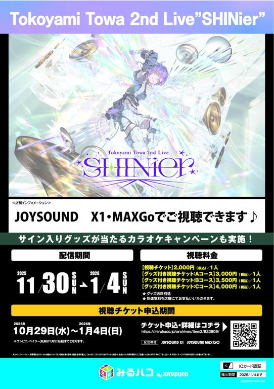 2025年12月1日 常闇トワ2nd ソロライブ 「SHINier」 常闇トワの2nd Liveの様子をみるハコで配信決定! 10月29日に有明アリーナにて開催された、「常闇トワ」の2nd ソロライブ 「SHINier」をみるハコにて11月30日(日)から期間限定配信決定♪『サイン入りグッツが当たるカラオケキャンペーンも実施』 みるハコご視聴希望の方は事前にお部屋のご予約をお願い致します。