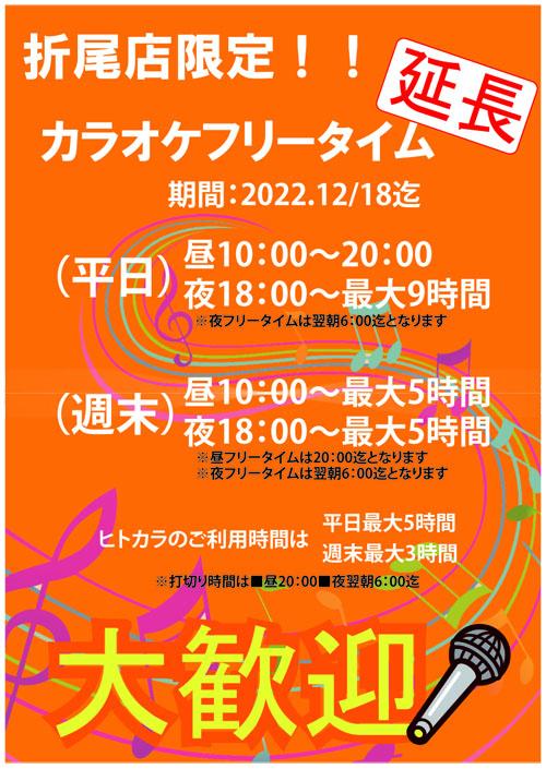 2022年12月8日 カラオケフリータイム延長中!! 期間限定でカラオケフリータイム延長を実施中(^0^V 平日お昼のご利用なら最大10時間! カラオケで歌って・ダーツで遊んで大満足なフリータイムプランになります。 もちろんフリードリンク付き!! 12月18日までの折尾店限定のサービスになりますので、是非ご来店ください。