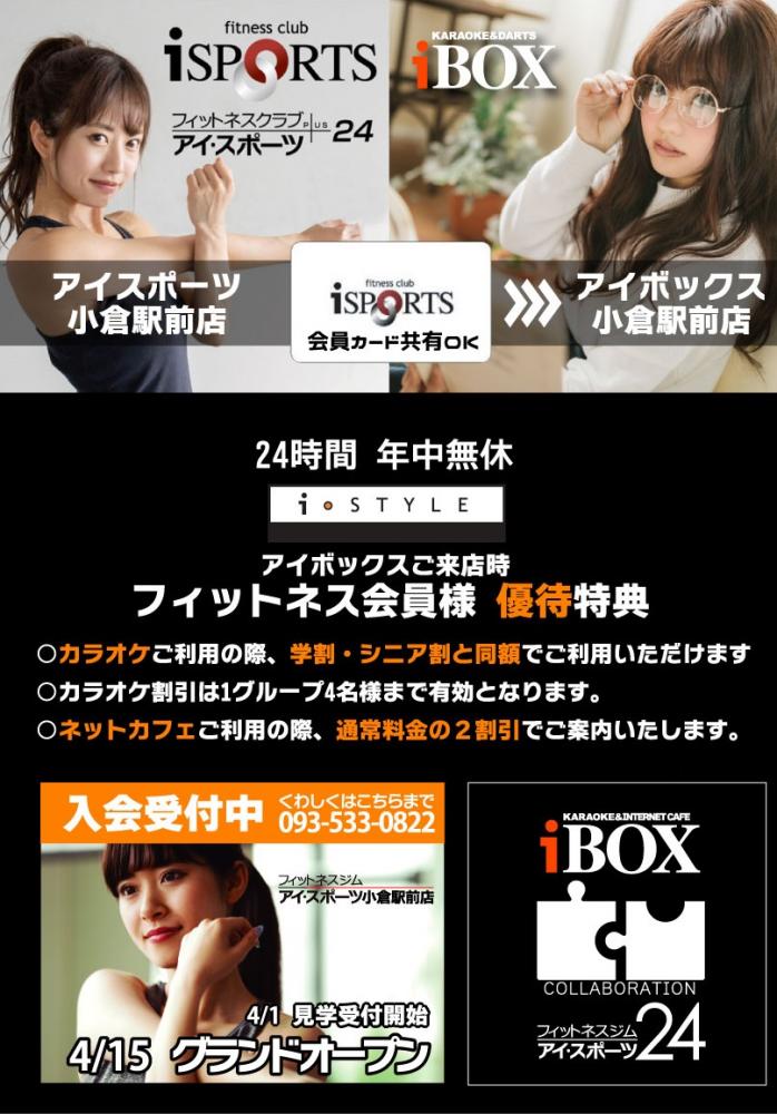 2022年4月2日 アイスポーツコラボ特典開始!! アイスポーツ小倉駅前店オープンに伴い、 期間限定でフイットネス会員様に お得な特典を提供開始♪ ☆優待特典内容☆ ・アイスポーツ会員カードでiBOX会員特典の共有可能に! ・ネットカファ・カラオケ・アミューズ室料割引! この機会に アイスポーツ・iBOXをお得にご利用ください^^v