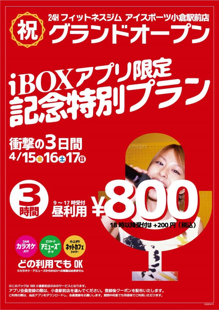 2022年4月13日 アプリ限定記念特別プラン! アイスポーツ小倉駅前店 グランドオープン記念と致しまして・・ アプリ会員限定特別プランを提供♪ 4/15(金)、16(土)、17(日)の3日間、 カラオケ・アミューズ・ネットカフェが・・ 「3時間¥800」でご利用できます!! (※18時以降受付は+¥200) たいへんお得なこの期間に ぜひご来店ください^^v ※iBOX小倉駅前店のみのサービスとなります。