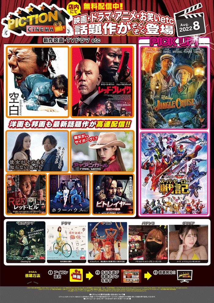 2022年7月26日 8月オススス映画 ■空白 「ヒメアノ〜ル」の吉田恵輔監督によるオリジナル脚本作品で、古田新太主演、松坂桃李共演で描くヒューマンサスペンス。 女子中学生の添田花音はスーパーで万引しようとしたところを店長の青柳直人に見つかり、追いかけられた末に車に轢かれて死んでしまう。 娘に無関心だった花音の父・充は、せめて彼女の無実を証明しようと、事故に関わった人々を厳しく追及するうちに 恐ろしいモンスターと化し、事態は思わぬ方向へと展開していく。 ■レッドブレイク 「ワイルド・スピード」シリーズのタイリース・ギブソンが主演を務め、愛する娘を守るため武装集団に決死の戦いを挑む元海兵隊員の活躍を描いたアクション。 シングルファーザーの元海兵隊員カイル・スノーデン。ある日、継父である偏屈な下院議員サム・ネルソンが経営するスーパーマーケットが武装集団に襲撃され、 店内にいたカイルと娘エンジェルもサムや従業員と一緒に人質となってしまう。娘を守りながら、持ち前のスキルを駆使して武装集団に立ち向かうカイルだったが……。 ■jungle cruise ディズニーランドでおなじみの人気アトラクション「ジャングルクルーズ」を実写映画化したアクションアドベンチャー。 アマゾンのジャングルの奥深くに「“奇跡の花”を手にした者は永遠の命を手にする」という不老不死の伝説があった。 行動力と研究心を兼ね備えた植物博士のリリーは、この秘密の花を求めて危険に満ちたアマゾンへ旅立つ。 ■スパーヒーロー戦記 「仮面ライダーセイバー」「機界戦隊ゼンカイジャー」の主人公たちを中心に、歴代のライダーや戦隊も登場し、世界を危機に陥れる最強の敵との戦いを繰り広げる。 ある時、「仮面ライダーセイバー」主人公の神山飛羽真たちが「機界戦隊ゼンカイジャー」の世界へ、そして「機界戦隊ゼンカイジャー」主人公の五色田介人たちが 「仮面ライダーセイバー」の世界へと迷い込んでしまう。 夏休みはインターネットカフェで映画鑑賞はどうですか♪