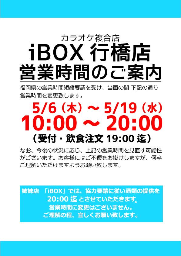 2021年5月5日 福岡県時短要請に伴う営業時間変更のおしらせ いつもご利用、ご来店誠にありがとうございます。 iBOX行橋店は時短要請に沿って営業を実施しております。 5/6(木)から 5/19水)まで 営業時間 10:00 - 20:00まで アルコールオーダーは19:00まで 感染症対策を適切に取り組み、安心、安全の環境を提供出来るよう、取り組んでおります。 皆様のご来店をスタッフ一同、心よりお待ちしております。