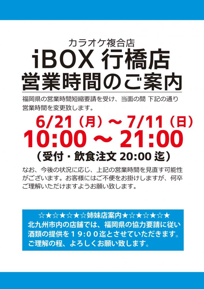 2021年6月20日 蔓延防止処置に対する営業自粛 いつもご利用ありがとうございます。 iBOX行橋店では蔓延防止処置に基づき下記の通り営業致します。 6/21(月)〜7/11(日)まで 10:00〜21:00まで営業。 飲食注文は20:00までとなります。 感染対策に取り組み、安心、安全を提供出来るように努めております。 お客様へはご不便をお掛けしますが、何卒ご理解いただけますようお願い致します。
