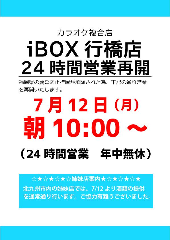 2021年7月11日 iBOX行橋店 通常営業再開! いつもご利用ありがとうございます。 iBOX行橋店では、蔓延防止措置に従い 時短営業を行ってきましたが、解除に伴い通常営業を再開致します。 7/12 10:00〜 24時間営業再開。 深夜帯のご利用も可能となります。 皆様のご来店、ご利用をスタッフ一同お待ちしております。