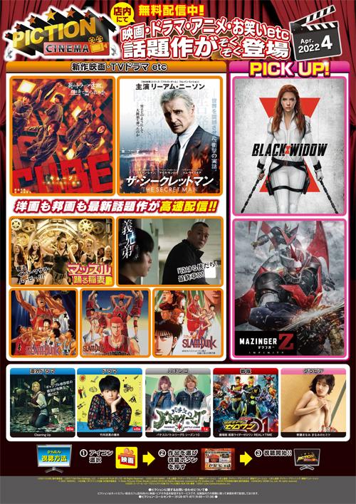 2022年4月22日 4月 シネマチャンネル配信紹介 ■CUBE 1997年に公開されたヴィンチェンゾ・ナタリ監督のサスペンス映画『CUBE』の初の公認リメイク作品!! 主演を務めるのは菅田将暉で、杏、岡田将生、田代輝、斎藤工、吉田鋼太郎が共演。 ■BLACK WIDOW ナターシャ・ロマノフはスーパー・スパイ、ブラック・ウィドウとしてその名を知られている。諜報に関するあらゆる分野で訓練を積み、最新鋭の技術を装備したブラック・ウィドウの戦闘技術に適うものはそうそういない。S.H.I.E.L.D.最重要エージェントのひとりとして、いくつもの秘密工作を成功させてきた。アベンジャーズのメンバーとしてもその恐るべき才能を悪に立ち向かうため惜しみなく使うのである。 ■MAZINGER Z 永井豪が1972年に「週刊少年ジャンプ」で連載した漫画を原作に、巨大ロボットにパイロットが乗り込んで戦うという搭乗型巨大ロボットの元祖となったアニメ「マジンガーZ」を、30年以上の時を経て劇場アニメ化。72〜74年に放送されたテレビアニメから10年後の世界を舞台に、主人公・兜甲児とマジンガーZの新たな戦いを描く。 その他の最新話題作が配信中♪ インターネットカフェをご利用の際は、是非動画コンテンツ「ピクション」をご利用ください。