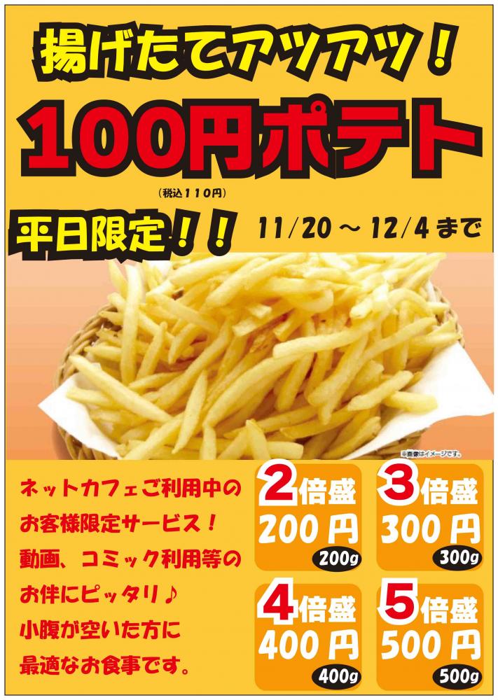 2020年11月18日 期間限定サービス開始! いつもご利用ありがとうございます。 行橋店ではネットカフェ利用のお客様へ お得なサービスを平日限定で開始致します。 期間2020.11/20〜2020.12/4まで お子様から大人まで、みんな大好きな フライドポテトを100円で販売致します。 さらに、2倍〜5倍まで増やす事が出来ます。 動画、コミック等、遊べるコンテンツが沢山あります。 お友達、ご家族で遊びに来てください。 皆様のご来店、ご利用をスタッフ一同お待ちしております。