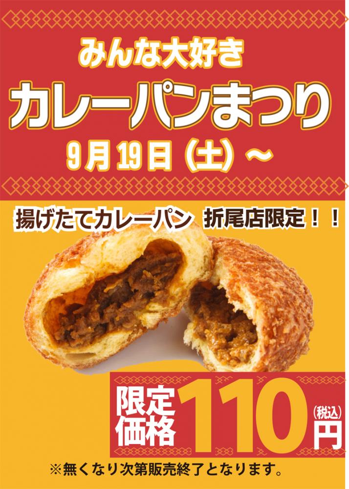 2020年9月19日 カレーパンまつり 期間限定サービスでカレーパンを110円(税込)で販売致します(^@^) 販売期間は9/19日(土)〜カレーパンが無くなり次第終了となります。 アツアツできたてのカレーパンをご賞味ください♪ ※折尾店限定のサービスになります。