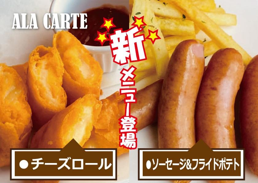 2022年10月26日 新メニュー登場!! 大好評!! 新メニューのご紹介です♪♪ ■チーズロール■ 濃厚な味わいの3種のチーズを使用!! とろっとコクのあるチーズソースを、 サクッとした食感の皮で包みました♪♪ ■ソーセージ&フライドポテト■ 「香り」高い風味がお楽しみいただける あらびきウインナー☆☆ 相性抜群のポテトと一緒に♪♪ ご来店時にぜひお試しください^^v