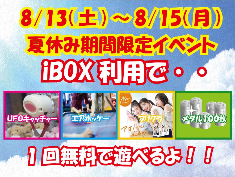 2022年8月13日 守恒店限定イベント♪ 8/13(土)から8/15(月) 守恒限定イベント実施!! アイボックス守恒店利用で・・ 隣ハイパーメッセの・・ ☆UFOキャッチャー☆ ★エアホッケー★ ☆プリクラ☆ ★メダル100枚★ の中より1つ1回無料で遊べるよ♪♪ 友人・家族一緒に、 アイボックスでお得に楽しみましょう!!