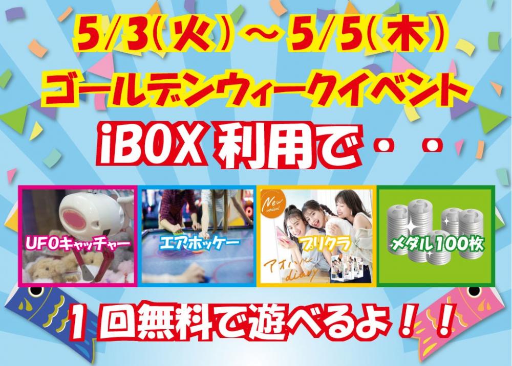 2022年4月29日 守恒店限定GWイベント♪ 5/3(火)〜5/5(木) 守恒限定GWイベント実施!! アイボックス守恒店利用で・・ 隣ハイパーメッセの・・ ☆UFOキャッチャー☆ ★エアホッケー★ ☆プリクラ☆ ★メダル100枚★ の中より1つ1回無料で遊べるよ♪♪ GWは友人・家族一緒に、 アイボックスでお得にワイワイ楽しみましょう!!