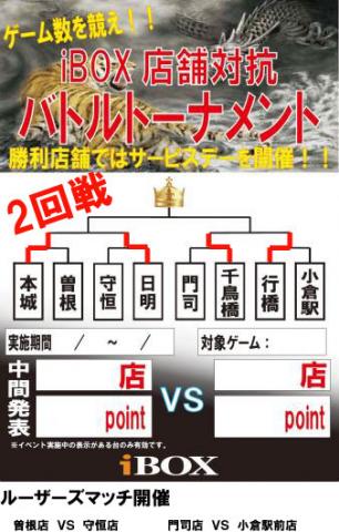 2013年1月5日 店舗対抗ダーツバトルトーナメント2回戦!! いつもご利用ありがとうございます。 iBOXオンラインダーツ導入店舗対抗バトルトーナメント2回戦開催中です。 1回戦は、本城店、日明店、行橋店、千鳥橋店が勝利致しました。 2回戦は、 期間:1/4〜1/24 種目:Sクリケットのプレイ回数 となっております。 また、ルーザーマッチも開催しています。 内容は上記と同じです^^ 曽根店 VS 守恒店 門司店 VS 小倉駅前店 イベント台でプレイすれば自動で集計される為、 特別な操作等は必要ありません。 勝利店舗ではサービスデーを実施致します。 是非、参加して店舗を勝利に導いてください♪