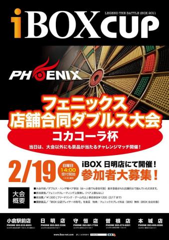 2012年2月6日 第2回iBOXカップコカコーラ杯in日明開催決定! お待たせいたしました^^ハウストーナメント「第2回iBOXカップin日明」を2/19(日)14:00〜開催いたします! 今回もハイ&ローのダブルス戦! 優勝チームには「ダーツフリーパス券」をプレゼント^^ 今回は副賞として「コカコーラ商品」を多数ご用意! 参加費は事前エントリー¥1200、当日参加費は¥1500となっております。 参加申し込みはiBOXフェニックス設置各店で行なっております。皆様ふるってご参加ください。