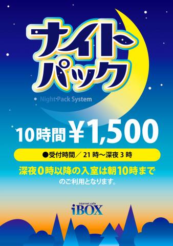 2011年10月30日 ナイトパックが11月からさらにお得に!! 11/1よりナイトパックが最長10時間に^^ 新ナイトパック 受付21:00〜3:00 料金¥1500 0時までに入室すると「最長10時間利用可能」 *0時以降の入室は「朝10時まで利用可能」 時間が伸びてさらにお得に!皆様のお越しお待ちいたしております。 *馬借店は変更はございません(受付18:00〜)