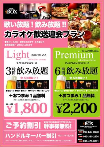 2010年3月11日 3/12より春の歓送迎プラン開始♪ 春になり、歓送迎会の季節となりました。 iBOX駅前・曽根・門司店より特別コース料金 を用意させていただきました。 開催期間3/12〜4/30まで ライトセクションコース お一人様 1800円 3時間歌い放題 飲み放題コース 提供料理 おつまみ一品無料!! プレミアムセクションコース お一人様 2200円 6時間歌い放題 飲み放題コース 提供料理 おつまみ一品無料!! 格安の料金で提供しております。 この機械に是非ご利用下さい。