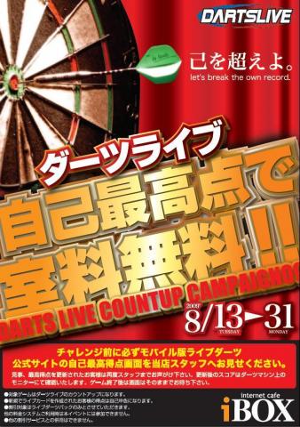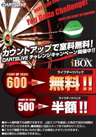 2009年9月1日 ダーツライブイベント開催♪♪ 先月に引続きiBOX駅前店では ダーツライブイベントを開催致します!(^^)! 今回のイベント内容は・・・ カウントアップイベントです♪ 500点を超えると室料半額 600点を超えると室料無料となっています。 お客様の挑戦をスタッフ一同お待ちしております。 ※室料半額・無料はダーツライブパックのみ とさせていただきます。