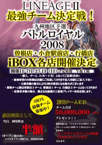2008年7月7日 『リネージュ?』最強チーム決定戦!!九州地区予選バトルロイヤル2008 iBOX最強チーム募集中 7/27(日)に曽根店・行橋店・小倉駅前店にて開催致します。 全店舗募集は行なっておりますので、詳しくは各店舗スタッフにお問い合わせ下さい。 個人・チーム(4〜5名)ふるってご応募下さい。 ※応募者多数の場合は、厳正なる抽選の上参加プレイヤーを決定致します。