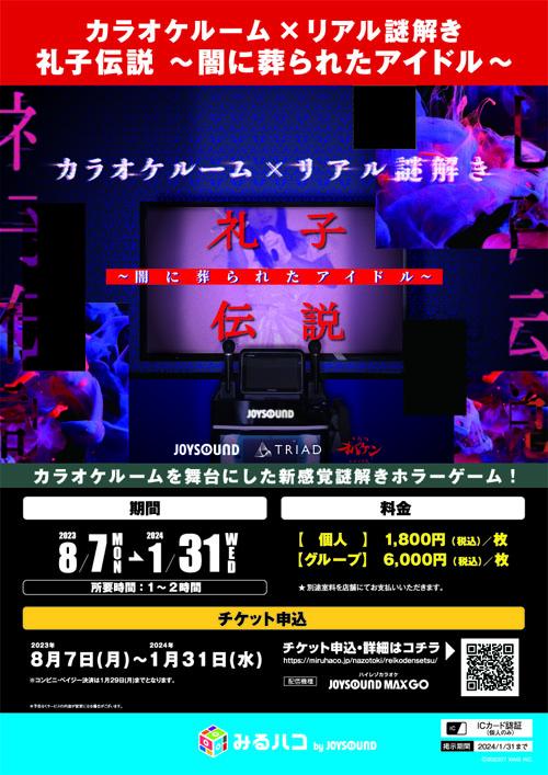 2023年8月30日 カラオケ×リアル謎解き 礼子伝説 ?闇に葬られたアイドル? 猛暑の暑さも吹き飛ぶ恐怖体験はいかがですか ? カラオケ×謎解きで「観る」に留まらない新たな体験型サービスを実施。 謎解きアプリ「TRIAD」を使って謎を解き、ストーリーを進行させクリアを目指す。 【ストーリー】 2023年夏、ある男がカラオケをしていると、 入れた覚えのない曲が再生され、奇怪な現象と共に亡くなった。 その映像はネットへ流出し、物議を醸した。 再生された曲は一体何なのか。 映像に映し出された奇怪な女は誰なのか。 不思議に思った人たちがこぞって映像を検証し、 その映像は“アイドルファンのあなた”のSNSにまで届いた。 しかし 映像を再生した時、あなたは「あること」に気がついてしまう。 そして今、 あなたはこの映像に隠された謎を明らかにするため、 意を決して怪現象が頻発しているカラオケルームにいる。 ◆制作協力◆ (株)AXELL:謎解きアプリ「TRIAD」の運営会社。本配信の謎解きを制作。 現実世界と仮想世界を組み合わせた没入感のあるこれまでにない新しい謎解き体験を追求するリアル謎解きブランド。