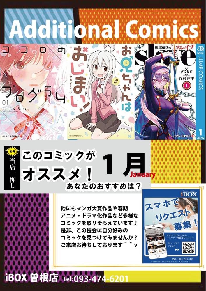 2023年2月1日 おすすめコミック入荷 いつもiBOX曽根店をご利用いただきありがとうございます。 おすすめコミックを入荷いたしました。 ・魔都精兵のスレイブ ・ココロのプログラム ・お兄ちゃんはおしまい アニメ・ドラマ・映画化作品など 多様なコミックを取りそろえています♪ 是非、この機会にiBOX曽根店をご来店ください。