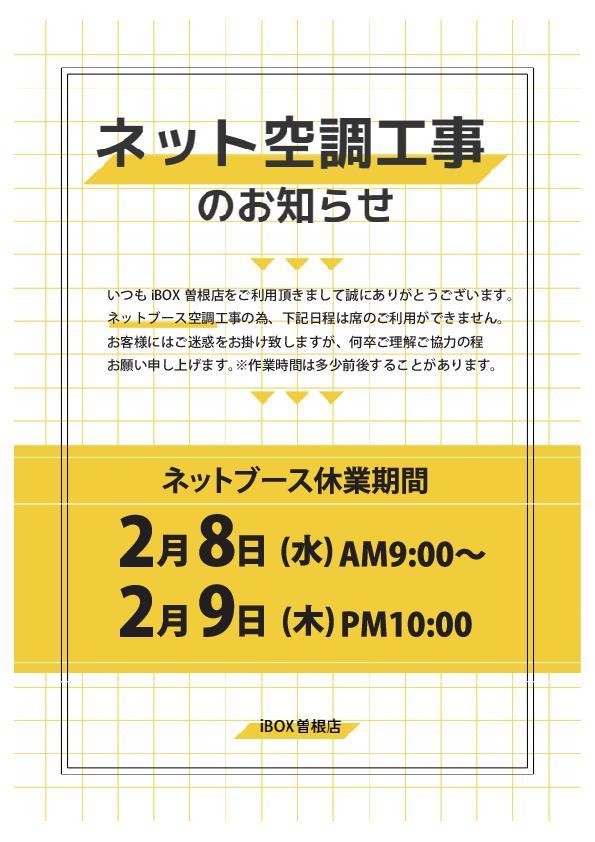 2023年2月7日 ネットブース空調工事のおしらせ いつも曽根店をご利用いただきまして、誠に有難うございます。 ネットブース空調工事の為、2/8朝9時?9日夜10時までの期間、ブース席のご利用が出来ません。 お客様にはご迷惑をお掛け致しますが、何卒ご理解ご協力のほど、お願い申し上げます。 ※カラオケ・アミューズは通常営業致します。