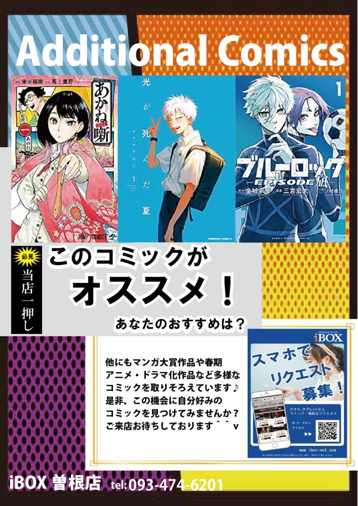 2023年3月21日 おすすめコミック入荷 いつもiBOX曽根店をご利用いただきありがとうございます。 おすすめコミックを入荷いたしました。 ・光が死んだ夏 ・あかね噺 ・ブルーロック-EPISODE 凪- アニメ・ドラマ・映画化作品など 多様なコミックを取りそろえています♪ 是非、この機会にiBOX曽根店をご来店ください。