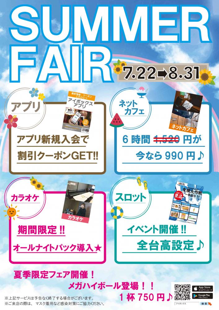 2022年7月22日 サマーフェア2022.7.22〜8/31 いつもご来店、ご利用有難うございます。 IBOX行橋店では、 7/22(金)〜8/31(水)まで サマーフェアを開催!! お得なプランから、飲食フェアまで ご来店されるお客様、すべてに楽しんで頂ける イベントを開催しております。 ぜひ、夏休み中に、お友達、ご家族をお誘い合わせの上、ご来店をスタッフ一同、心よりお待ちしております。