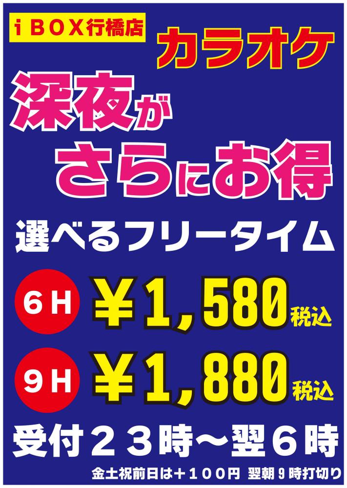 2022年8月21日 深夜フリータイム登場!! いつもご利用、ご来店ありがとうございます。 iBOX行橋店では夏休み期間 長く遊んで頂けるように深夜フリータイムを開始致しました。 23時以降のご来店で最大朝8時まで ご利用出来るフリータイムが登場。 もちろん、ドリンクバー付き♪ 価格は9時間 ¥1,880 もちろん、今まで通りの6時間 ¥1580もございます。 ぜひ、この機会にご来店、ご利用をお待ちしております。