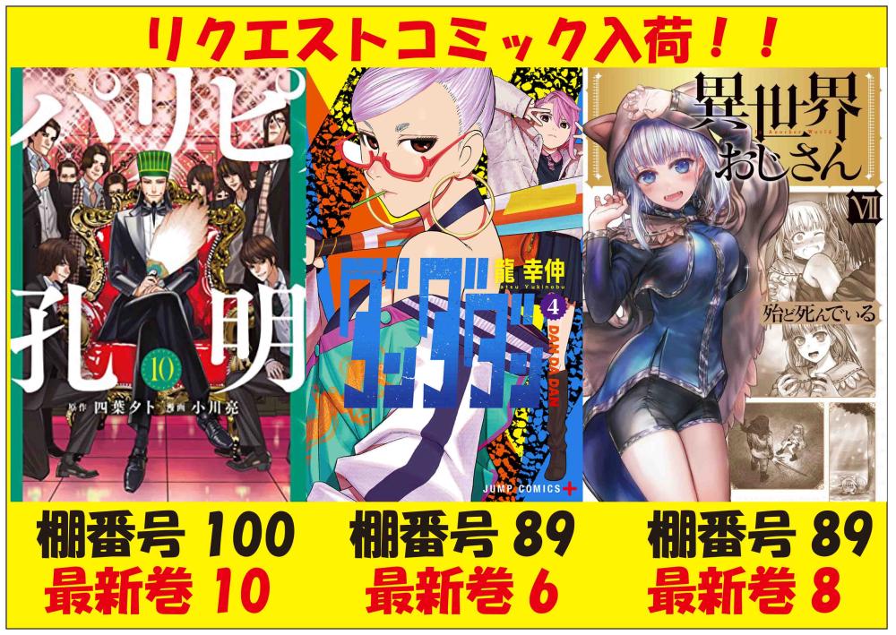 2022年9月20日 リクエストコミック入荷致しました! いつもご利用ありがとうございます。 リクエストコミックスが入荷致しました! 人気作品を3タイトル追加致しております。 昼のお得な「6時間パック」¥990でのご来店をオススメ致します。 皆様のご来店、ご利用をスタッフ一同心よりお待ちしております。