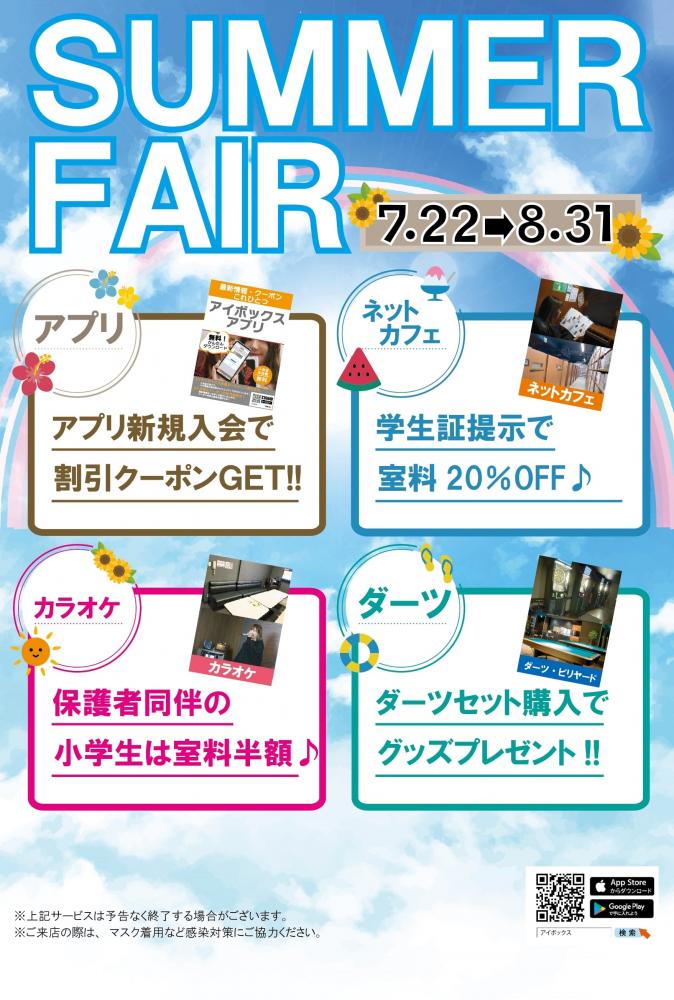 2022年7月31日 サマーフェアー開催中♪ 曽根店では 7/22(金)〜8/31(水)まで サマーフェアを開催中!! ☆アプリ会員限定☆ ☆ネットカフェ☆ ☆カラオケ☆ ☆アミューズ☆ お得なプランから、飲食フェアまで すべてに楽しんで頂けるイベント を開催しております。 是非、今年の夏は、お友達・ご家族をお誘い合わせの上、iBOXで「お得」に遊びましょう♪♪ ご来店をスタッフ一同、心よりお待ちしております。