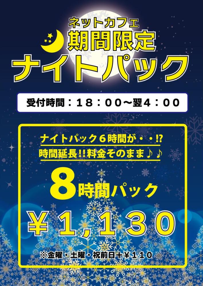 2022年12月1日 期間限定!!ネットカフェナイトパック☆★ ナイトパックが更にお得に♪♪ ナイトパック6時間が・・!? 料金はそのままで、ご利用時間延長^^v 期間限定で 8時間 ¥1,130 この機会にぜひご来店下さい!! ※小倉駅前店のみのサービスとなります。