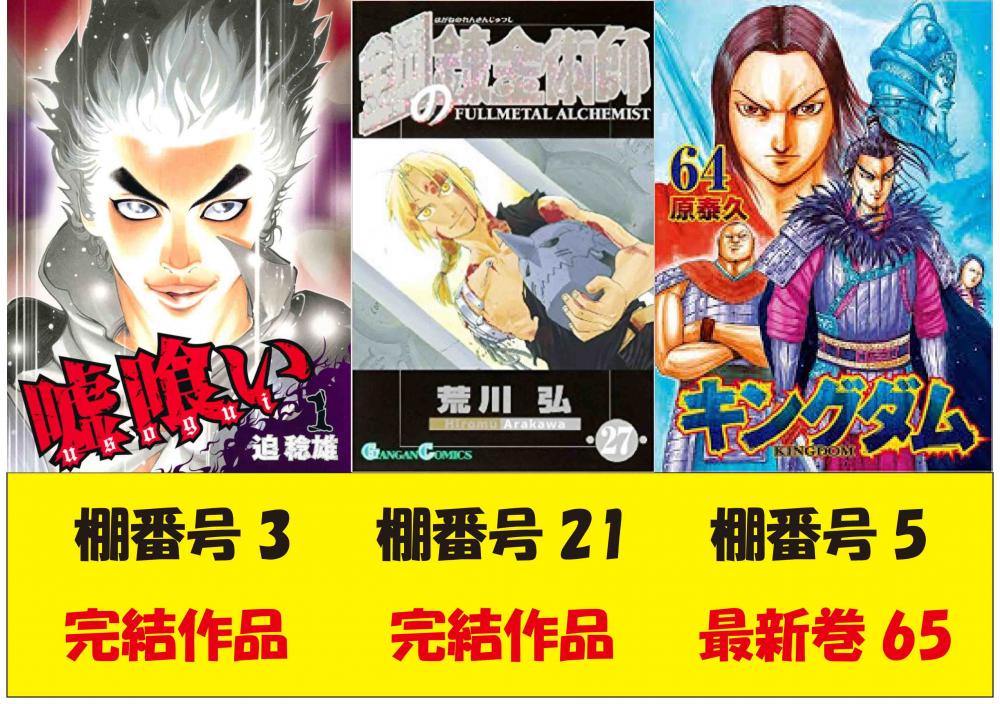 2022年6月7日 映画化コミック紹介♪ いつもご利用、ご来店ありがとうございます。 6月は2022年公開予定。映画化コミックスを紹介致します。 映画『キングダム2 遥かなる大地へ』(2022年) 大人気漫画、キングダム映画の続編です。 今月最新刊が入荷予定となっております。 棚番号 5番 映画『鋼の錬金術師 完結編 復讐者スカー』(2022年) 全3部作の2部作品目となります。 コミックスは完結。 イッキ読みにピッタリです。 棚番号 21番 映画『嘘喰い』(2022年) コミックスは完結。スピンオフ作品有り。 こちらも読み応え抜群です。 棚番号 3番 その他、ホリック、カラダ探し、極主婦道 等 多数の映像化コミックを揃えております。 18時までのご来店で6時間 990円と大変お得なパック料金を実施しております。 ※行橋店限定サービスです! ぜひ、この機会にお楽しみください。 スタッフ一同、お客様のご来店、ご利用をお待ちしております。