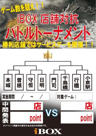 2012年12月10日 店舗対抗ダーツバトルトーナメント開催!! いつもご利用ありがとうございます。 iBoxオンラインダーツ導入店舗対抗バトルトーナメント開催中です。 1回戦は 期間:12/7〜12/20 種目:501のプレイ回数 となっております。 イベント台でプレイすれば自動で集計される為、 特別な操作等は必要ありません。 勝利店舗ではサービスデーを実施致します。 是非、参加して店舗を勝利に導いてください♪