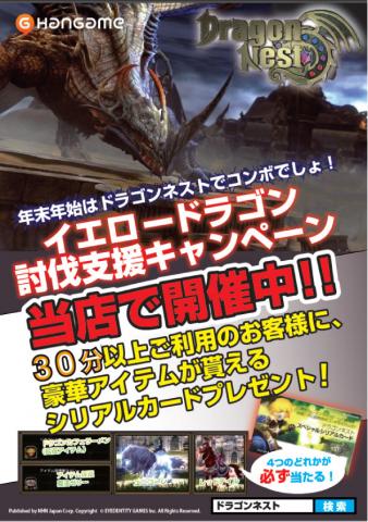 2012年12月19日 ドラゴンネスト イエロードラゴン実装記念キャンペーン開始!! ■キャンペーン期間 12月19日(水)メンテナンス終了後〜1月16日(水)予定 ドラゴンネスト公式ページ内お知らせ、特設ページ にて告知 ■キャンペーン内容 ・カーリー ハンゲームアバター プレゼント(キャンペーン期間中、公認店から2時間以上プレイ) ・DNメダル カーリーレアアバターセット(7日間)追加 ・DNメダル 交換品大幅プライスダウン ■ネットカフェ特典 ・DNメダル:1枚/10分 ・経験値:2倍(1.2倍から強化されております。) ・復活コイン:10枚 ・疲労度:+1000 ・ダンジョンクリア報酬:+1 ・ネストダンジョンクリア報酬:+1 ・ネットカフェ称号:4種 さらにアイボックスでは、上記期間中に30分以上ご利用されたお客様に豪華アイテムがもらえるシリアルカードをプレゼントいたします♪ 年末年始は特典がいっぱいです♪ 全店一同、お客様のご来店お待ちいたしております。 ※日明店、千鳥橋店は除く