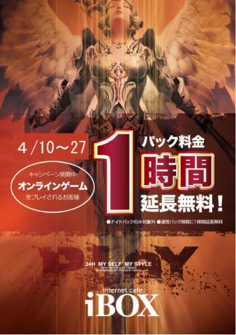 2012年4月13日 オンラインゲーム+1時間延長無料! いつもご利用ありがとうございます。 4/10より27日(金)まで 期間限定でオンラインゲームをプレイされるお客様へ1時間延長サービスを実施しております。 お得なサービスとなりますので、ぜひこの機会にご来店いただきますよう、心よりお待ちしております。 ※店舗により対象パック料金が異なります。
