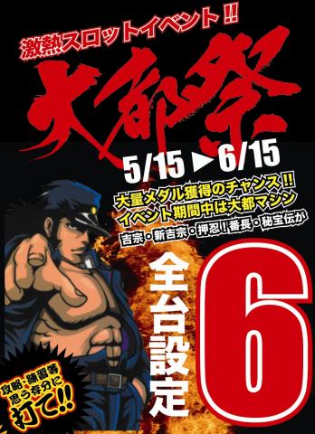 2010年5月20日 スロットイベント開催中 大人気!! 大都の人気台の設定6イベントが開始しました。 定番の吉宗・番長・秘宝伝に新たに今回は新吉宗も加わりました^o^V 大当たりの大連続が期待の出来るスロット台なので是非楽しんで見てください。 期間 5/15日〜6/15日までやってます。