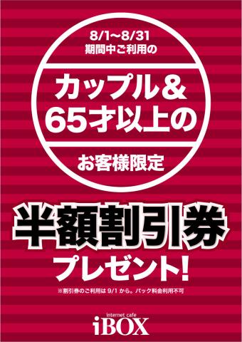 2010年7月31日 8月スタート「iBOX夏の5大イベント」その3 iBOXの「夏のイベント」まだまだやっちゃいます! その3は9/1より使える「シニア(65歳以上)&カップル」に室料半額券をプレゼント! *基本料金での入室時のみご利用可能です。 8月中にご利用頂いたシニア&カップルのお客様にお配り致します!来店ごとにお渡し致します!このチャンスお見逃しなく!!
