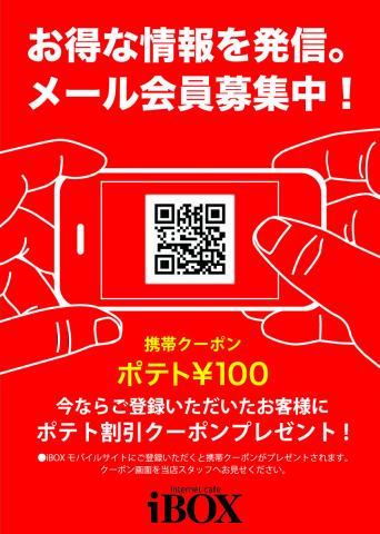 2010年4月16日 メール会員募集中!! お得な情報知りたい情報が携帯に届く「メール会員」サービスがスタート! 5/9までに登録して頂いた方には「ポテト¥100」クーポンをプレゼント中^^ ダーツ大会のご案内やコミックの新着情報、オンラインゲーム情報などはもちろん、メール会員のみのサービスも盛りだくさん。 (登録時にご希望のコンテンツをお選び下さい) iBOXがさらにお得に楽しくなる「メール会員サービス」各店に設置してあるポスターのQRコード又は携帯電話から p-iboxmail@s.nowgetta.com へ空メールを送信してください。 (折り返し登録用メールが届きます。) 尚、ドメイン設定などを行なっている場合、登録用メールが届かない場合がございます。解除してからご利用ください。