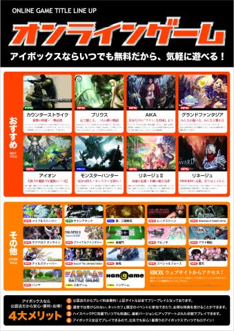2010年5月5日 オンラインゲーム公認タイトルが変わりました!! 5月よりアイボックスのオンラインゲーム公認タイトルが変わりました。 公認店だからプレイ料金無料!! ネットカフェ限定のイベントやお得な特典をGET!! アイボックスなら安心・便利・お得!! いつでもお気軽にプレイしてください。 ※店舗によっては一部できないタイトルもございます。詳しくは各店舗のスタッフにお聞きください。
